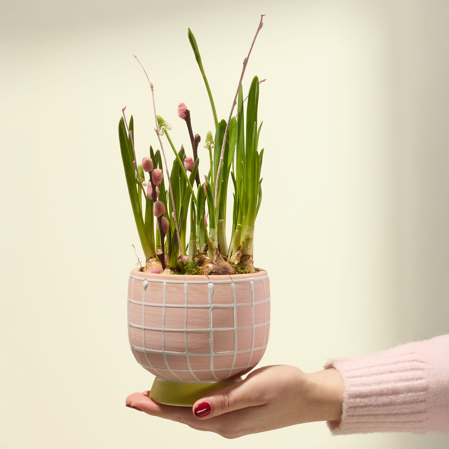 Happy Spring fühlt sich an wie ein frischer Frühlingsgruß direkt vor der Haustür. Zarte Narzissen bringen mit ihren leuchtenden Blüten sofort gute Laune, während die weichen Weidenkätzchen dem Arrangement eine natürliche Leichtigkeit verleihen. Gemeinsam erzählen sie von Neubeginn, Licht und kleinen Glücksmomenten. Mit einer Wuchshöhe von ca. 20 cm passt die Pflanze perfekt auf Fensterbank, Tisch oder Sideboard. Der rosa karierte Keramikübertopf mit gelbem Sockel sorgt für einen verspielten Farbakzent und macht Happy Spring zu einem echten Hingucker. In der Topfgröße von 9 cm benötigen die Frühlingsboten nur wenig Platz. Sie lieben einen hellen Standort und regelmäßiges Gießen – dann schenken sie dir und deinen Liebsten jeden Tag ein Lächeln.