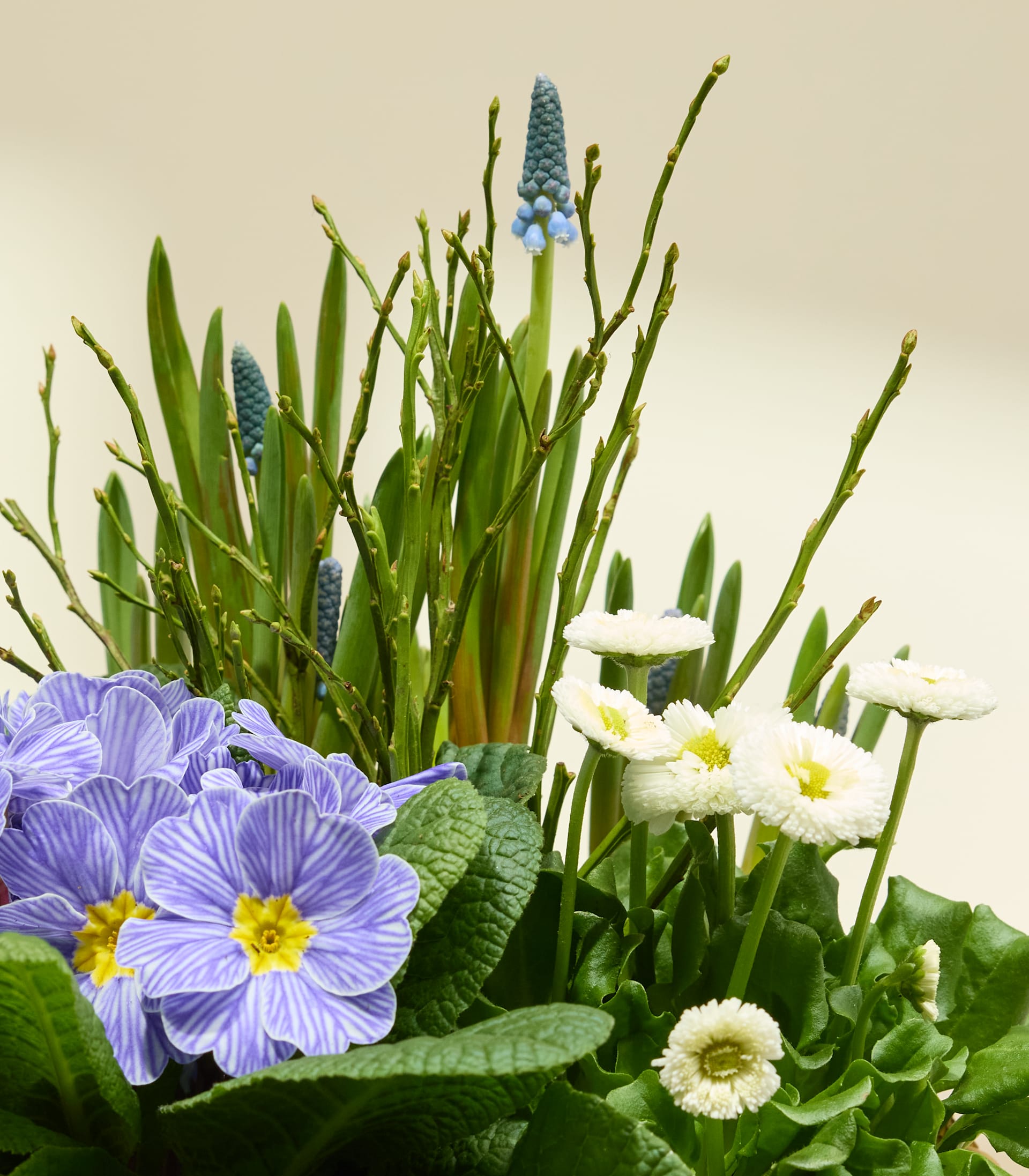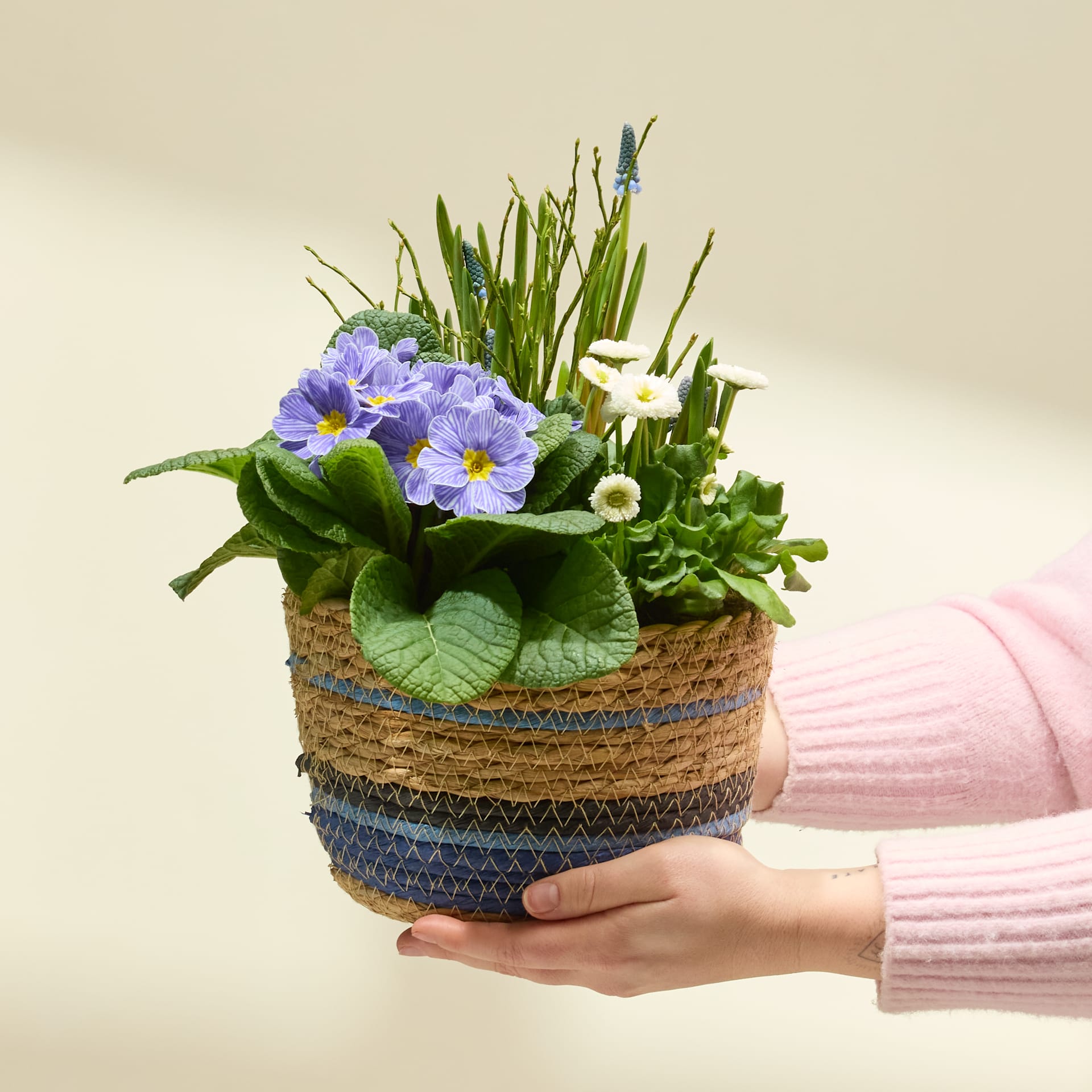 Mit Blaupause verschenkst du ein kleines Frühlingsgefühl, das jeden Tag aufs Neue Freude schenkt. Bellis, Primeln und Muscari verbinden sich zu einem lebendigen Arrangement voller Farben, Leichtigkeit und natürlicher Harmonie. Liebevoll im Korb arrangiert, wirkt dieses Pflanzengeschenk wie ein gemalter Frühlingsmoment – frisch, freundlich und herzlich. Ob auf dem Balkon, der Terrasse oder vor der Haustür: Dank ihrer Outdoor-Eignung fühlen sich die Pflanzen draußen besonders wohl und zeigen dort ihre ganze Blütenpracht. Blaupause ist das ideale Geschenk, um deinen Lieblingsmenschen eine Auszeit vom Alltag zu schenken und zu zeigen, wie sehr du an sie denkst. Ein natürlicher Gruß, der bleibt, wächst und jeden Tag ein Lächeln zaubert.