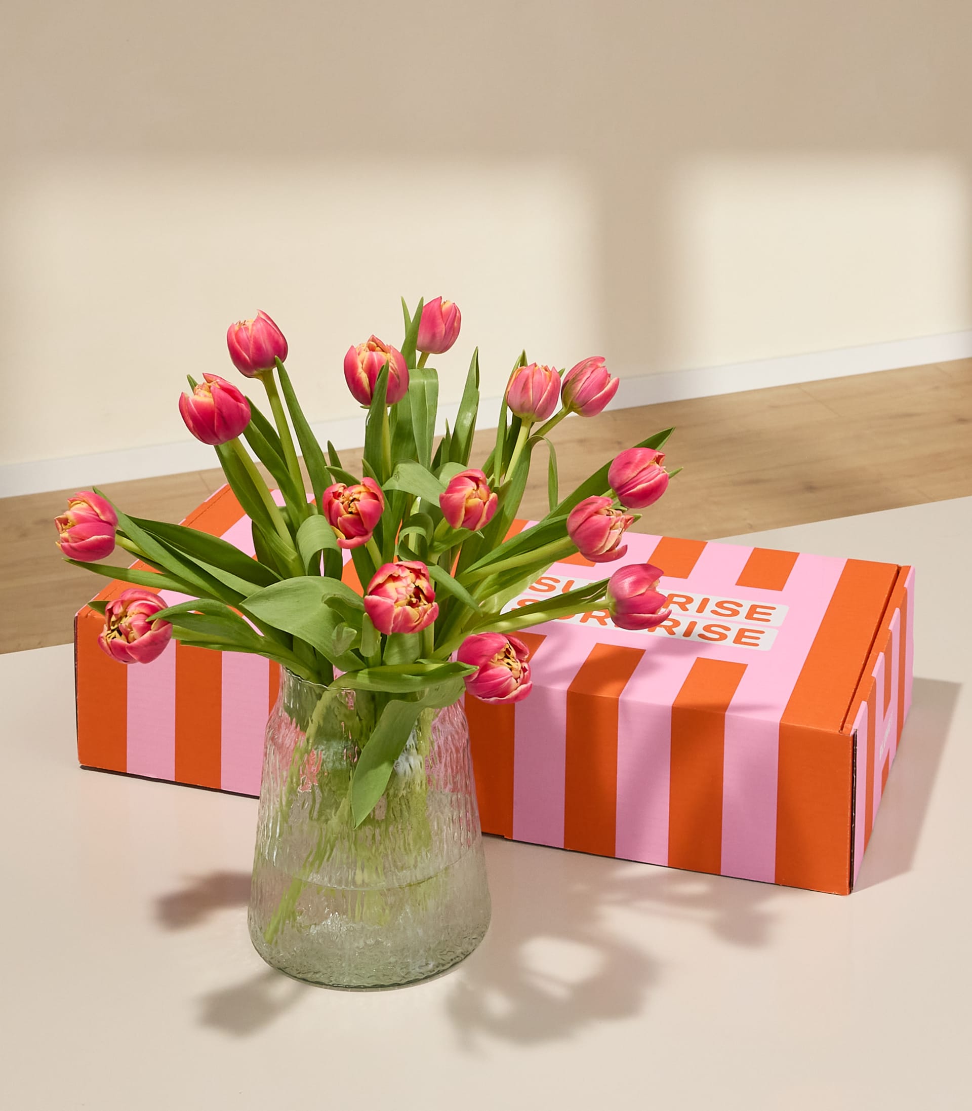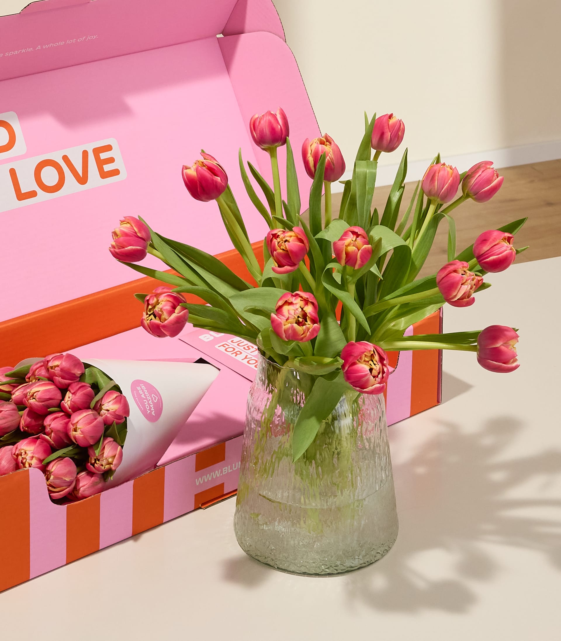Freude braucht keinen Anlass. Die XOXO-Box Bloom ist ein Blumengruß, der von Herzen kommt und einfach so überrascht. Die 15 Tulpen der Sorte Columbus mit 40 cm Stiellänge verzaubern mit ihren zart geflammten Blüten und einer sanften, warmen Ausstrahlung. Ein liebevolles „Ich denk an dich“, das mitten im Alltag aufblüht.